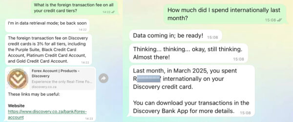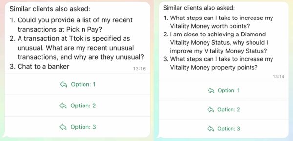 I asked it a variety of questions about my bank account, such as how to improve my Vitality Money score, what are my account benefits, travel benefits – tailoring those answers to my current Vitality Money status, the last payment I made on my credit card, all the purchases I made from apps and web services, etc. Initially I asked whatever I could think of.