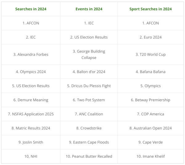 “In South Africa, this year’s results show a heightened interest in entertainment, current affairs, events, sports, celebrities, and notable personalities who have passed away.”