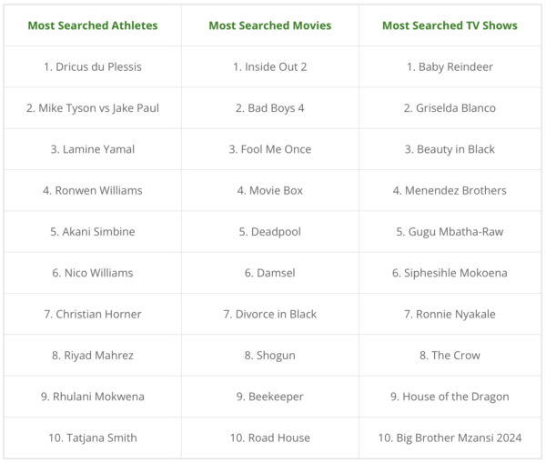 Google South Africa has shared its annual year in search results for 2024 that covers top searched words, interests, individuals and top movies, TV and sporting events.