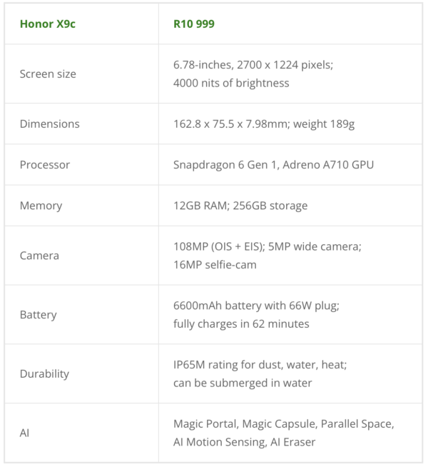 The Honor X9c has a solid build and is rated for dust, water and heat resistance. It introduces artificial intelligence features to this mid-tier segment device so customers get good value for money, without breaking the bank, according to Honor SA.