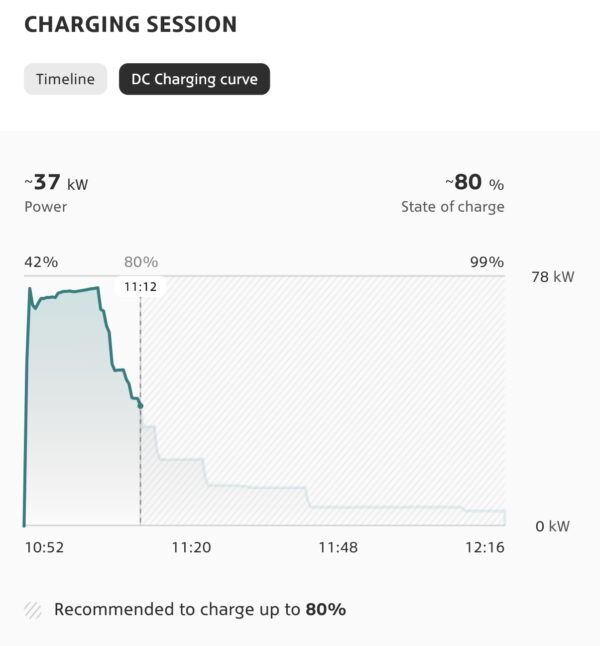 As you are all aware, to keep the battery in an optimal condition, it is best to charge it to 80%, and why you see the stats of 10-80% charge time shared for all EVs. It’s the quickest charge up until 80%. It took only 20 minutes to get the battery from 42% to 80%, thereafter it was trickling (while we ate).