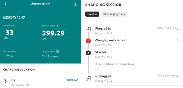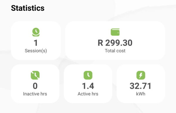 As you can tell, very efficient charger, does the job well except for initiating and ending the charge. But at what cost? This is the most expensive charger I’ve used, at R9.15 per kWh (R299.30 ÷ 32.71). I mean, to be fair, nobody makes a profit from an EV charger.