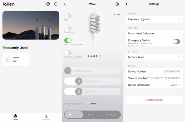 The clean interface shows your linked product and battery life at a quick glance but once you tap into it, you can see full controls for the toothbrush, and of course accessing the settings for firmware updates and calibration.
