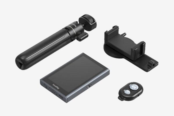In addition to the SmallRig monitor, the vlogging kit comes with a phone clamp, phone support, remote control and charging cable with a user manual.