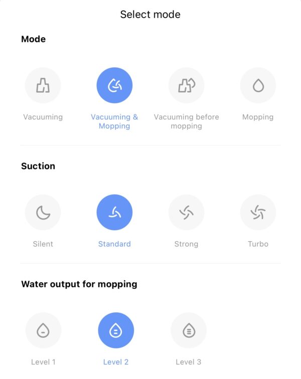 There’s a bunch of granular controls, like how hot you want the water to be for cleaning the mop (room temp, warm, hot, smart), water output (deep mop washing, daily mop washing), and rewash mop pads according to its dirt level.