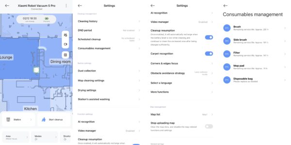 For example, each part, like brush, side brush, filter, mop pad and disposable bag, you can see how many hours are left of use before replacing. You can get parts at the Xiaomi store or online through various retailers.